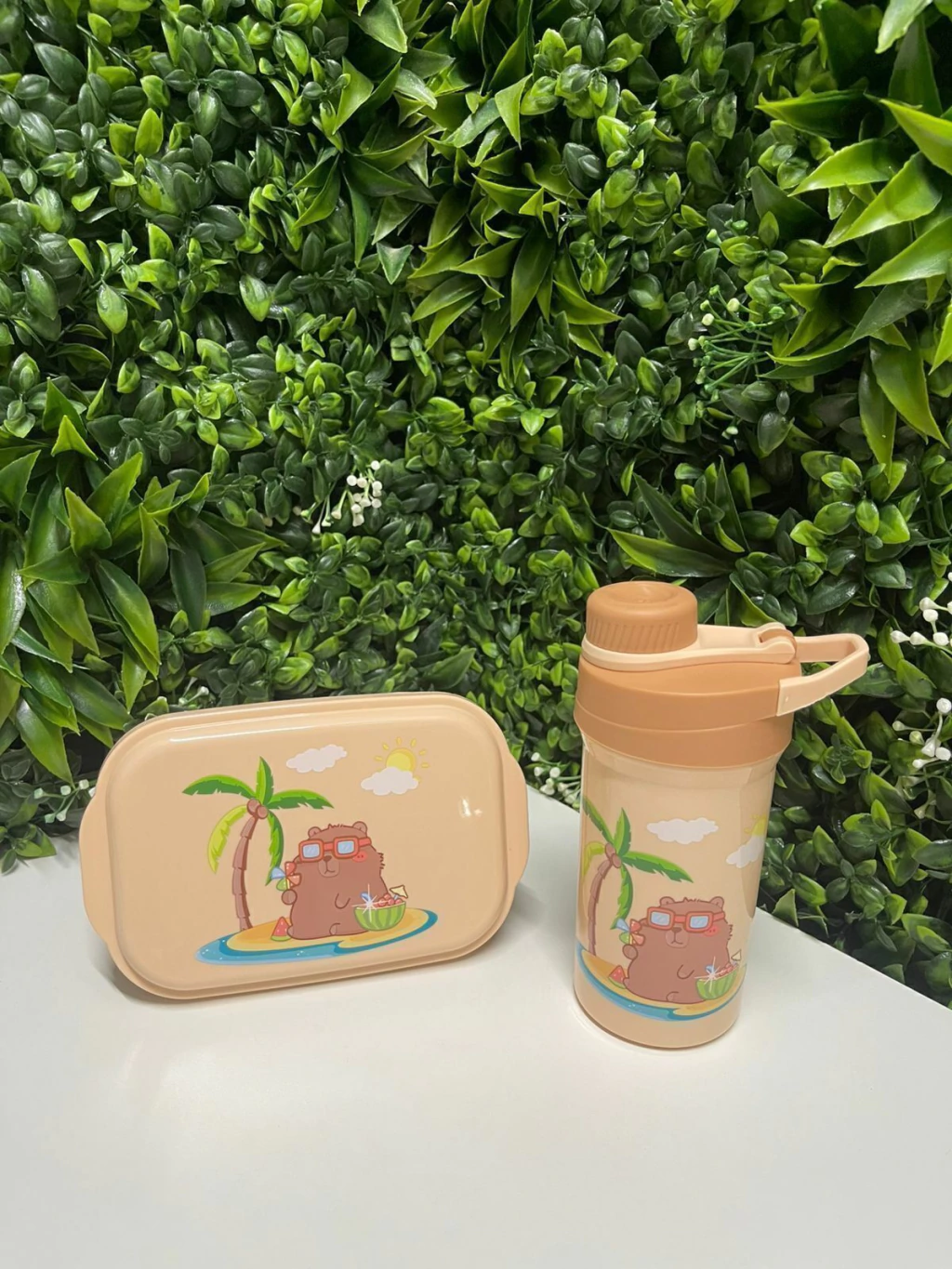 E uma opção prática e divertida para quem busca levar suas refeições de forma organizada. Ele vem com uma garrafa, ideal para manter suas bebidas sempre à mão, e possui travas laterais que garantem um fechamento seguro, evitando vazamentos e mantendo os alimentos frescos. O design é encantador, com a temática de capivara, que traz um toque de personalidade ao seu dia a dia. É perfeito para quem leva marmitas para o trabalho, escola ou passeios!