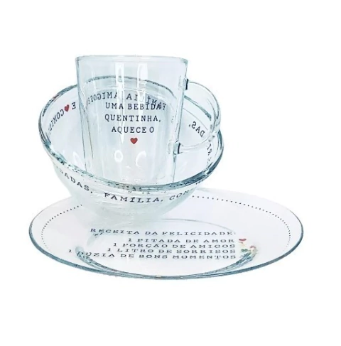 Composto por uma caneca, uma tigela e um prato, o kit se destaca pela sua versatilidade e design minimalista. A beleza do vidro permite que as cores e texturas dos alimentos brilhem, transformando cada café da manhã em um pequeno ritual de bem-estar e apreciação.